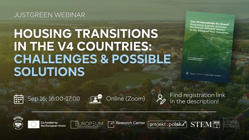 EUROPEUM a projekt JustGreen vás zvou k účasti na diskusi, která spojuje výzkumníky z celé V4, aby společně prozkoumali jednu z nejaktuálnějších otázek současnosti: Jak národní plány renovace bydlení odpovídají realitě – a co je třeba změnit, aby byly úspěšné?