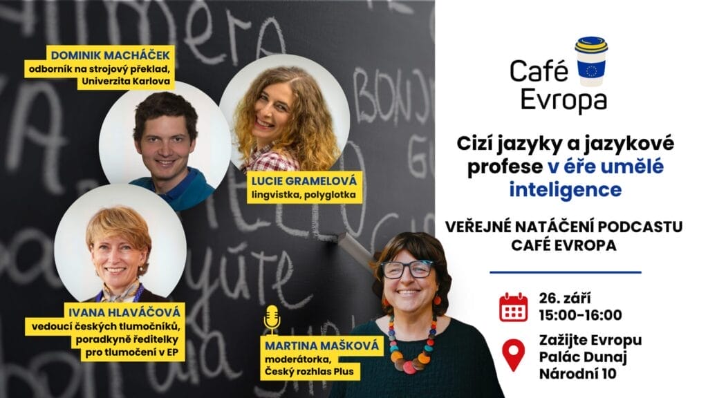 Zveme vás na veřejné natáčení podcastu Café Evropa! Umělá inteligence mění pravidla hry v řadě oblastí a obzvláště viditelně v jazykových profesích. Nahrazuje překladatele, tlumočníky i učitele cizích jazyků, nebo jim naopak otevírá nové možnosti? Přijďte v pátek 26. září diskutovat o tom, zda i v době AI má studium jazyků smysl, nebo se stává jen starosvětskou kratochvílí!