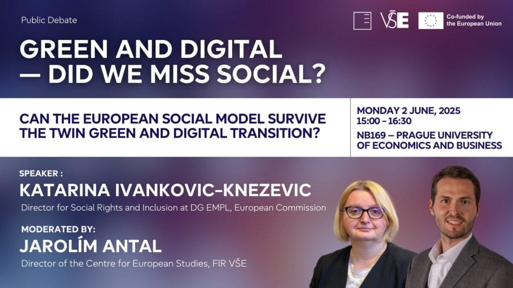 Dne 2. 6. se na Vysoké škole ekonomické v Praze konala debata na téma budoucnosti zelené a digitální Evropy. Hostkou byla ředitelka pro sociální práva a začleňování na Generálním ředitelství pro zaměstnanost, sociální věci a začleňování Evropské komise Katarina Ivanković-Knežević a debatu moderoval ředitel Centra evropských studií Fakulty mezinárodních vztahů Jarolím Antal