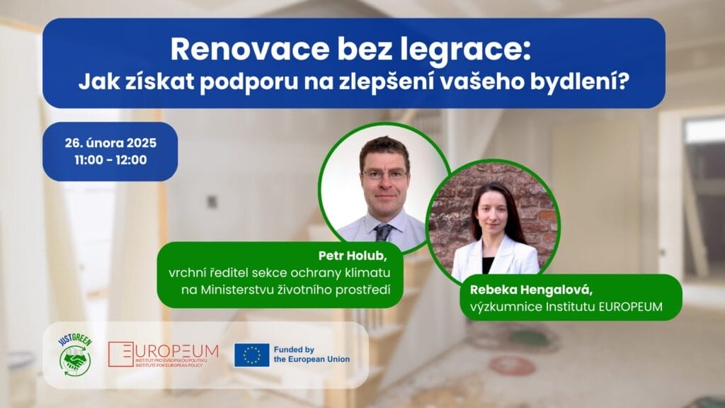 Chcete se dozvědět více o tom, co si Češi myslí a co dělají v oblasti energeticky úsporné renovace svých domů a snižování spotřeby energie v domácnostech? Institut pro evropskou politiku EUROPEUM Vás zve do diskuse v online webináři, kde budeme společně mluvit o zkušenostech občanů s energeticky účinnými rekonstrukcemi domovů, ale i o tom, jak je lze motivovat, jaké jsou hlavní překážky či jak může stát podpořit jejich úsilí prostřednictvím dotačních programů, zejména skrze Nová zelená úsporám. V rámci debaty představíme hlavní zjištění z našich rozhovorů s občany a z focus groups, které v Česku pořádá projekt Institutu EUROPEUM JustGreen.